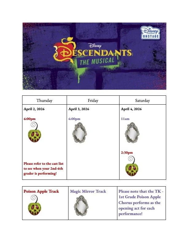 Tickets are free to the community and are limited to 6 tickets per family, per performance. Please reserve only what you need and release any that you do not need so everyone has opportunity to see the performances. Additionally, please note that we have two tracks: The Poison Apple Track and The Magic Mirror Track. Those tracks refer to the 2nd-6th grade performers in Descendants. Our TK-1st Grade Poison Apple Chorus will open each performance with their own adorable performance. Poison Apple Chorus members do not need tickets to watch the big kids perform after they finish their performance, but all adults and family members will need tickets.
